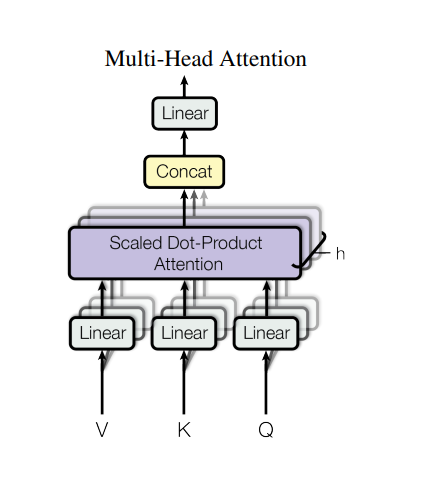 The multi-head attention is going to predict attention between every position with respect to every other position hence we will have vectors that embed the words in each one of those positions. Then we simply carry out attention computation that treat each word as a query and then find some key that correspond to the other words in the sentence and then take a convex combination of the corresponding value. When we compute attention we look at pairs together in one block and then repeat it multiple times (n times) hence we have n stacks of blocks having the pair of pairs combination.